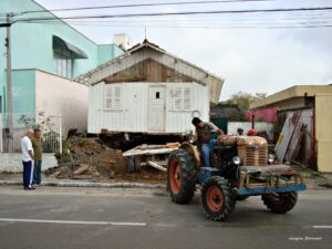 Um fato interessante com relação às casas de madeira era que elas podiam mudar de lugar. A casa de madeira era suspensa por macacos possantes, colocada em cima de toras planas, sujas com graxa, sebo de boi e banha de porco – para deslizar. Assim ela podia ser empurrada pela base e levada alguns metros para dentro do próprio terreno. As vezes essa operação era necessária para fazer o recuo de uma casa que estava fora do alinhamento da rua, segundo padrões da prefeitura. O proprietário também podia colocar a casa para o lado ou para trás, dentro do seu próprio terreno, para ganhar espaço na parte frontal do terreno e construir uma nova casa ou abrir seu comércio, etc. Além de ser empurrada alguns metros a casa também podia ser transportada para um lugar distante. Isso ocorria com o uso dos tratores. Itajaí possuía uma frota formidável de tratores, os populares ‘grilos’, que transportavam tábuas de madeira até o cais do Porto de Itajaí. No transporte das casas eram tirados os móveis e o telhado. Todo o trabalho de transporte da casa era facilitado porque elas não eram fixadas diretamente no solo do terreno. Todas elas eram suspensas em sapatas. Isso evitava alagamentos e, também, abria uma área coberta para depósito de objetos de pouco uso cotidiano, como ferramentas de jardim e lavoura, restos de madeira. Também serviam como área de brincadeiras para as crianças. A casa era suspensa por macacos grandes e colocada em sapatas feitas com pedaços grossos de madeira rígida. Tinha de ficar um pouco acima da altura da carreta. Quando a casa estava suspensa nas sapatas de madeira, colocava-se a carreta na parte de baixo e vagarosamente ia descendo a casa, até ela ficar totalmente apoiada na base da carreta do trator. No tempo antigo era comum encontrar casa andando pelas ruas da cidade no período noturno.