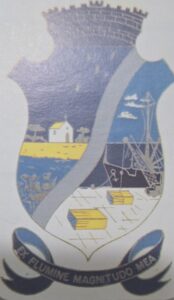 3 – âncora em cor dourada colada no fundo azul escuro, por debaixo da faixeta prata representando o rio. A âncora representa o porto e todas as atividades fluviais